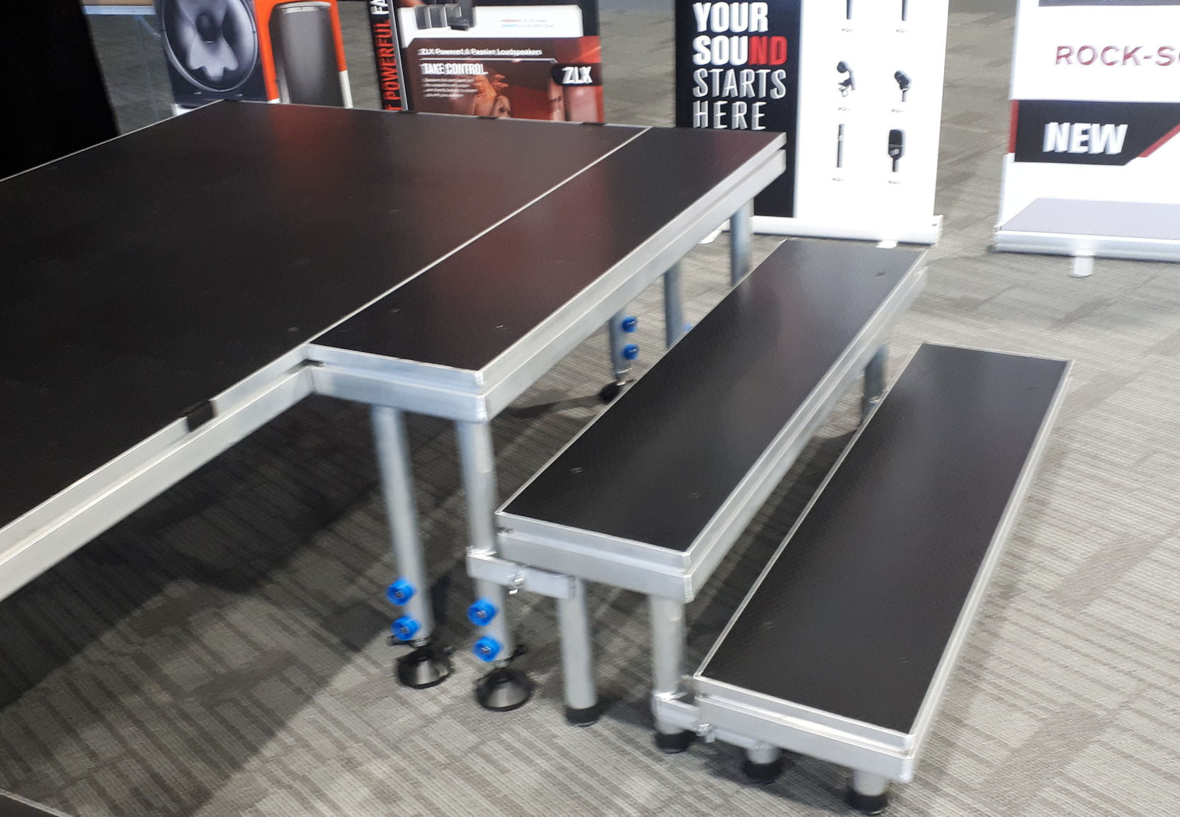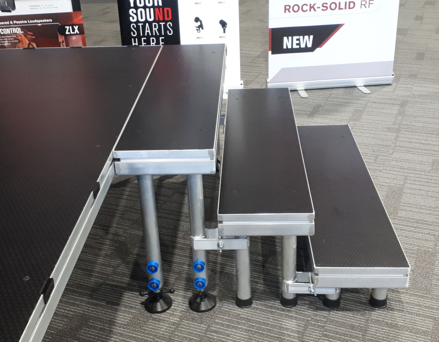Supplied with 6 leg locking clamps. Each step is designed to lock into the JD's stage panels.