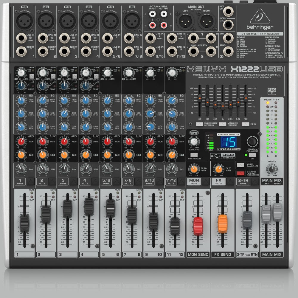 The compact XENYX X1222USB mixer allows you to effortlessly achieve premium-quality sound. Channels 1 – 4 feature XENYX Mic Preamps, renowned for their pristine performance, plus 2 of the 4 stereo channels accept XLR inputs, as well as Line-Level sources. All mono channels get ultra-musical “British” 3-band EQs and easy to- use “one-knob” compressors for the ultimate in punch and clarity. The 24-bit, dual engine Multi-FX processor with 16 editable, professional-grade presets that include reverb, chorus, flanger, delay, pitch shifter and multi-effects makes the X1222USB an incredibly versatile mixer for your live performances.