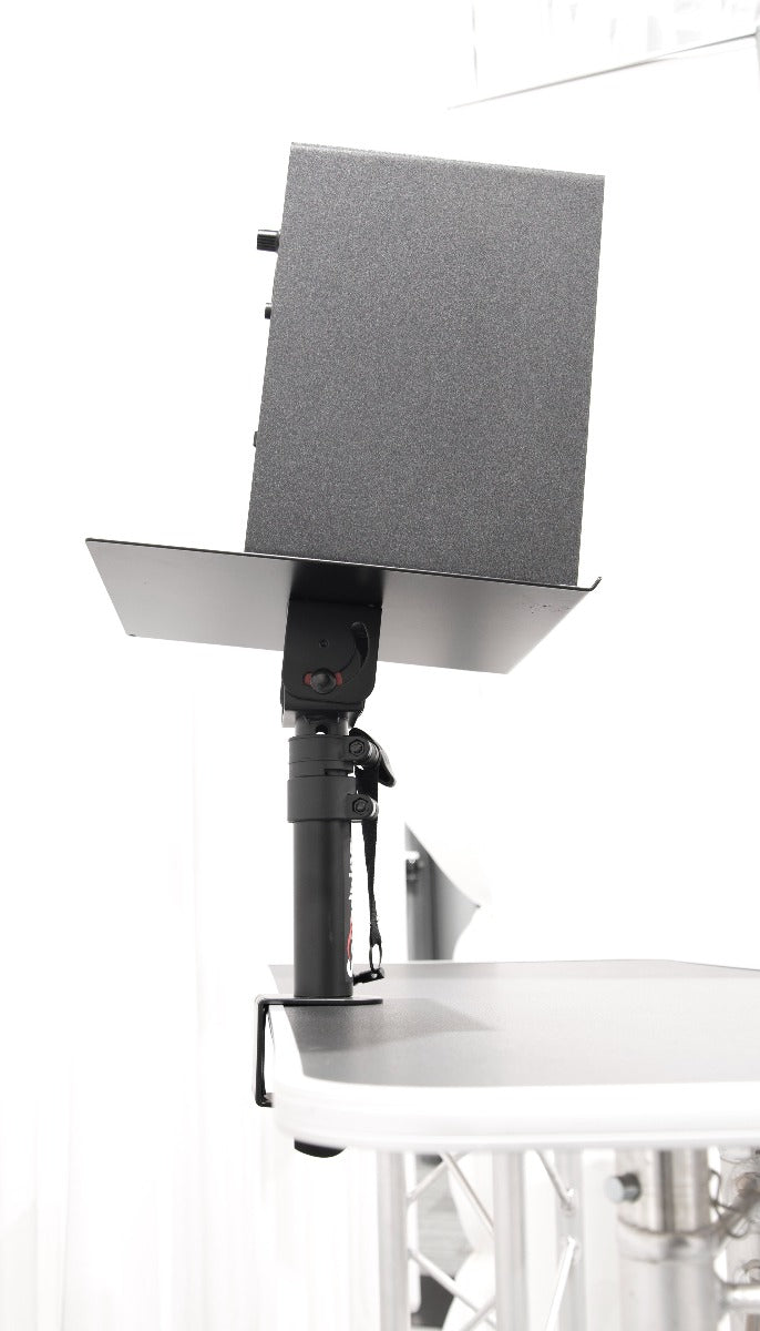 An adjustable stand with sturdy steel construction, heavy duty with a clamp bracket and 2 foam strips which can be attached to the top tray to prevent monitor movement.
