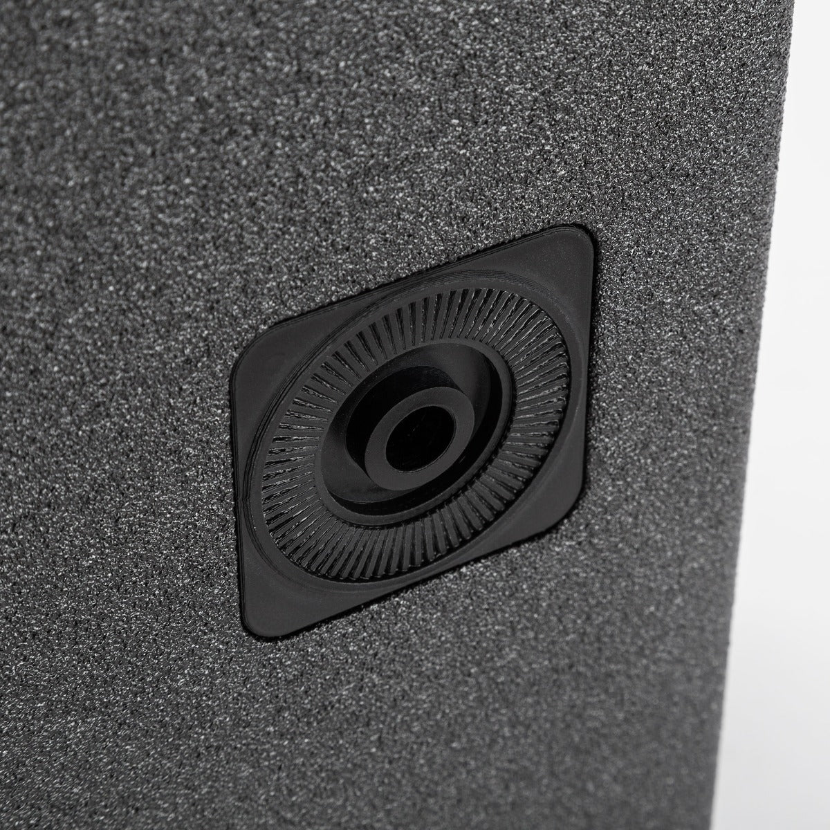 The cabinets feature an aluminum top handle designed to facilitate transport positioning and loading operations. A bottom pole socket allows the use as a point source sound system on a stand or subwoofer pole. The speaker cabinet is made of high-quality Baltic birch plywood with a special adhesive to glue every layer; this makes the cabinet completely water resistant even before the special polyurea paint, applied to make it highly resistant to scratches and bumps.