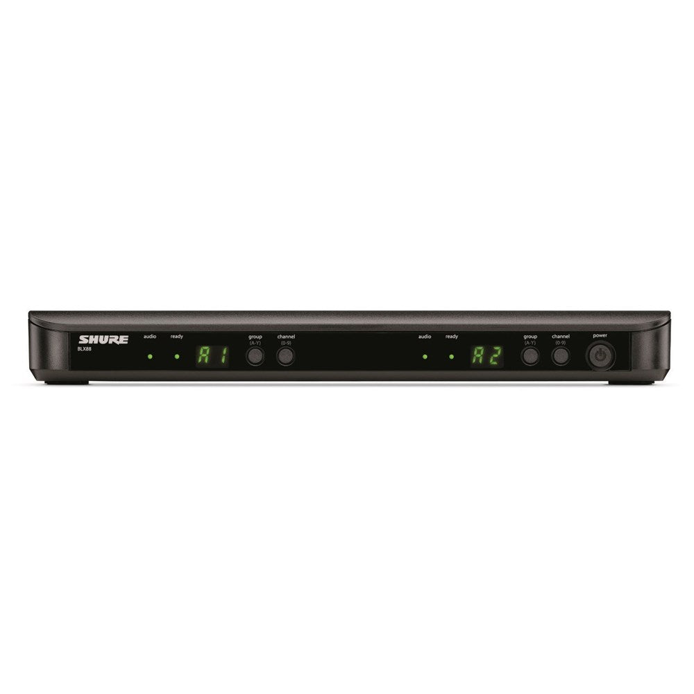 The BLX88 wireless receiver is a durable, dual channel receiver with simple set-up, intuitive controls and microprocessor controlled internal antenna diversity. One-touch QuickScan frequency selection quickly locates the best frequency, enabling simple set-up with up to 12 compatible systems per frequency band.