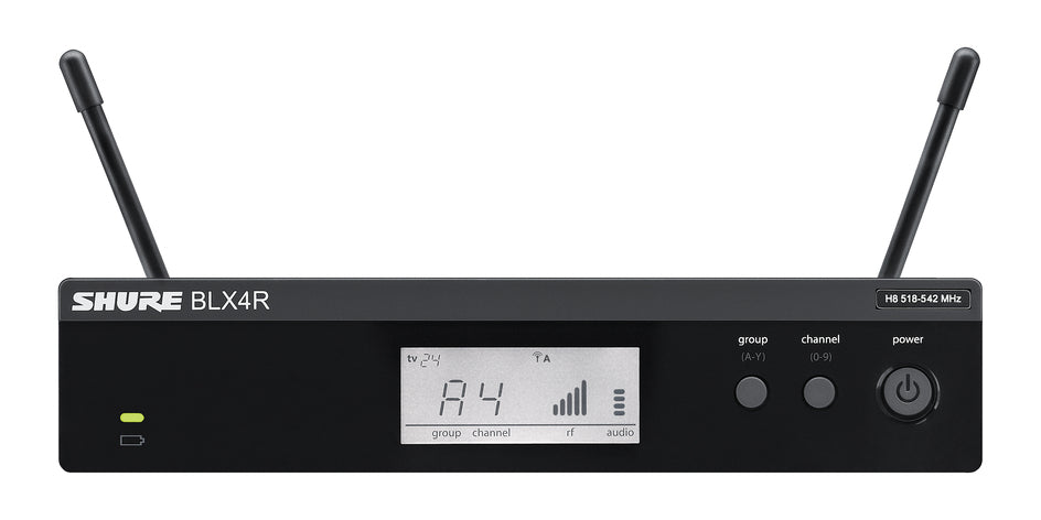 Rack-mountable and featuring rugged metal construction, the BLX4R offers simple setup and intuitive controls. One-touch QuickScan frequency selection quickly locates the best open frequency in case of interference. Removable antennas allow for quick antenna distribution. For use with BLX® Wireless Systems.